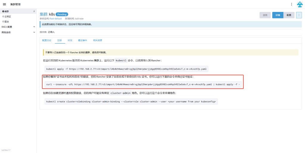 [rke@m01 ~]$ curl --insecure -sfL https://192.168.2.77/v3/import/l4b4k94wwzrw8rvgjbpl2hmrpdwrjjdgq8598lvzm9qch92lw5xkv7_c-m-v4vxch7p.yaml | kubectl apply -f -